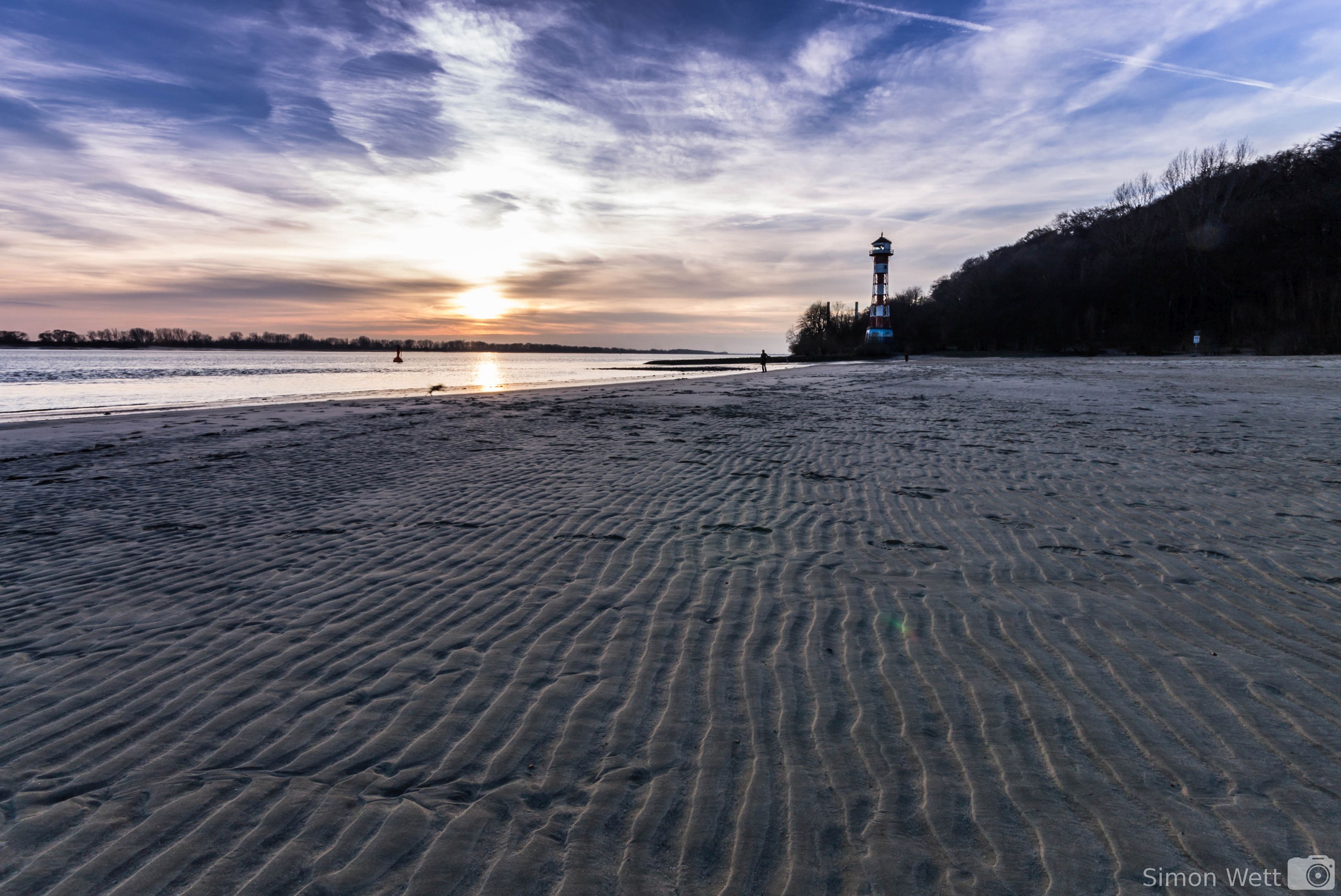 Dort bin ich ewig nicht gewesen und schon gar nicht zum Fotografieren. Dabei bieten der Leuchtturm und der Elbstrand wunderschöne Motive. Dazu kann man die Steine der Uferbefestigung und die, sich darum bildenden Pfützen sehr schön in den Vordergrund nehmen. Im Bild links kommt mir noch der Kondensstreifen am Himmel zupass, denn so bilden der kleine Priel und er zusammen zwei Linien, die das Auge in das Bild hineinführen, was allgemein als sehr harmonisch empfunden wird. Der Leuchtturm ist hier einfach noch zu weit entfernt um das Bild alleine zu dominieren und so hilft ihm ein ansprechender Vordergrund richtig zur Geltung zu kommen.