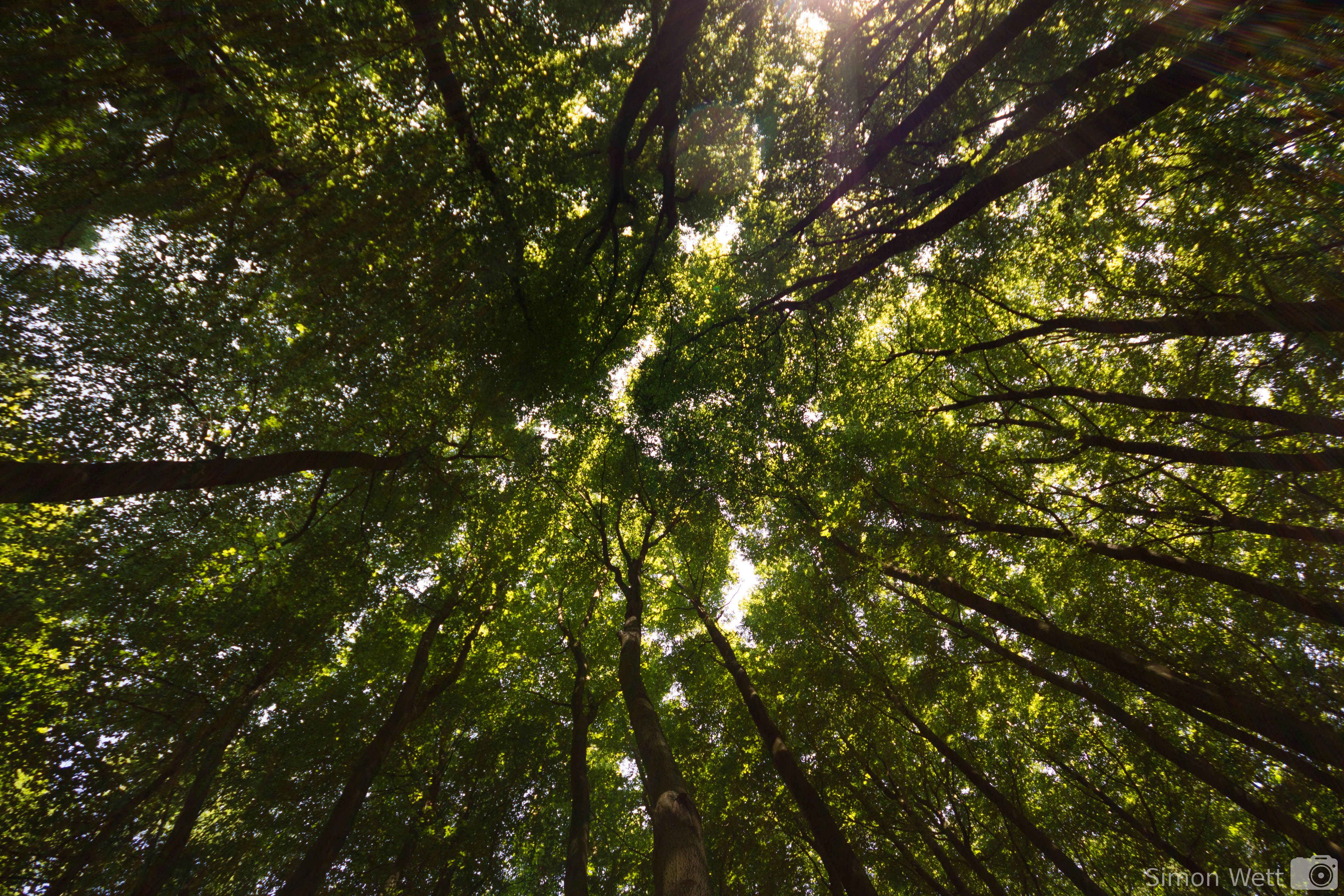 Das Licht, das durch die Blätter auf den Boden fällt ist wunderschön, speziell im Hochsommer (das Bild stammt aus dem Juli 2014). Ganz besonders beim Blick nach oben zeigt sich das satte Grün der Blätter. Da bietet sich ein Foto, senkrecht nach oben geschossen, an. Bei einem Weitwinkelobjektiv (10 mm) ensteht dabei noch der schöne Effekt, dass die Baumstämme alle auf die Mitte des Bildes zuzustreben scheinen.