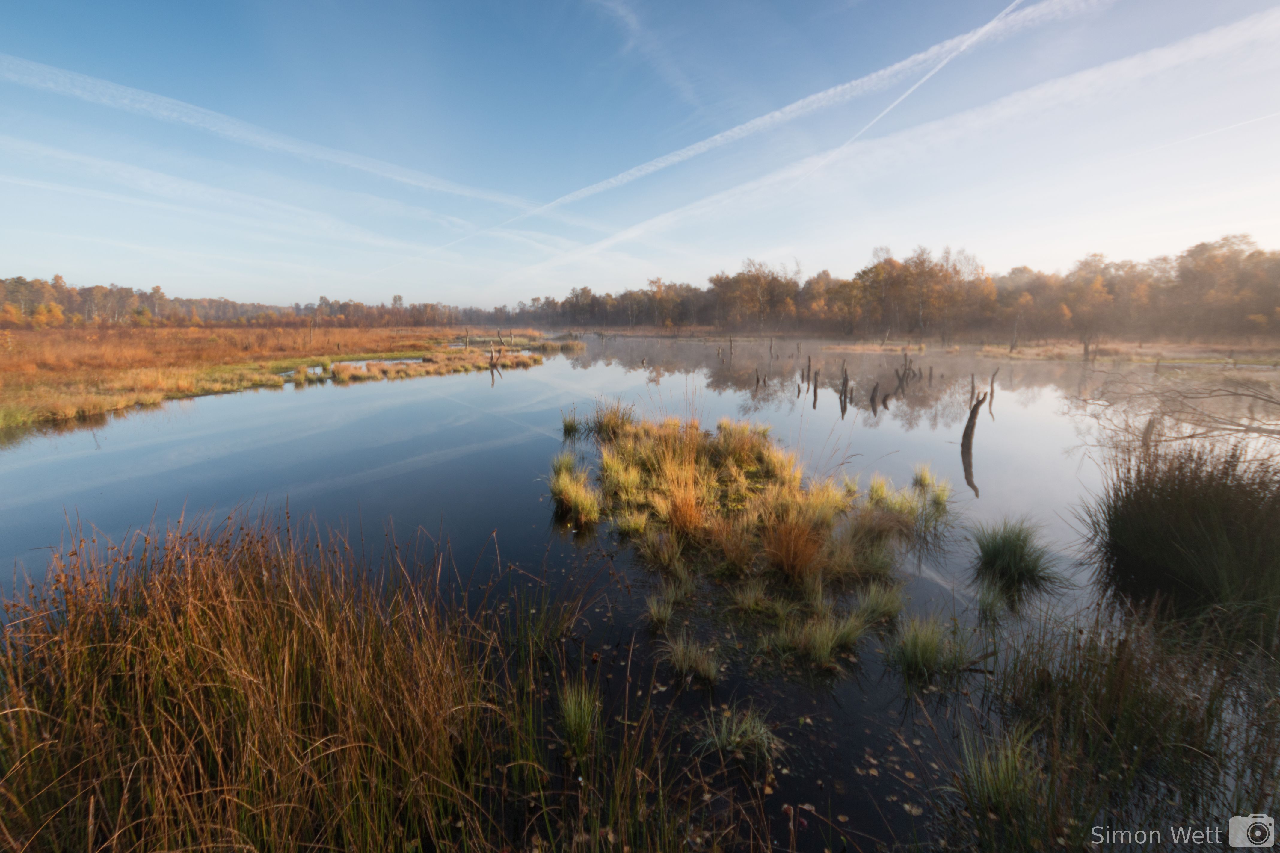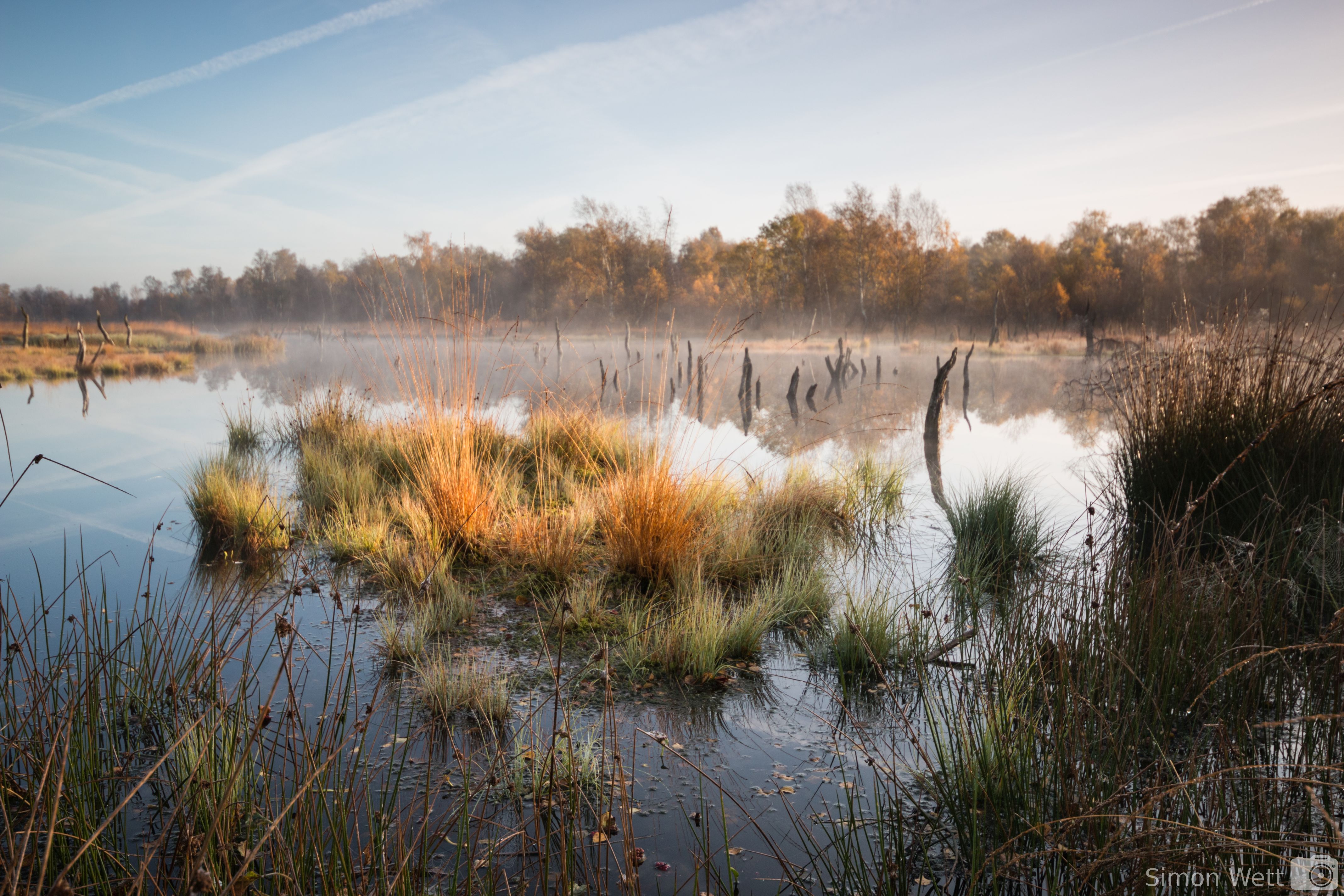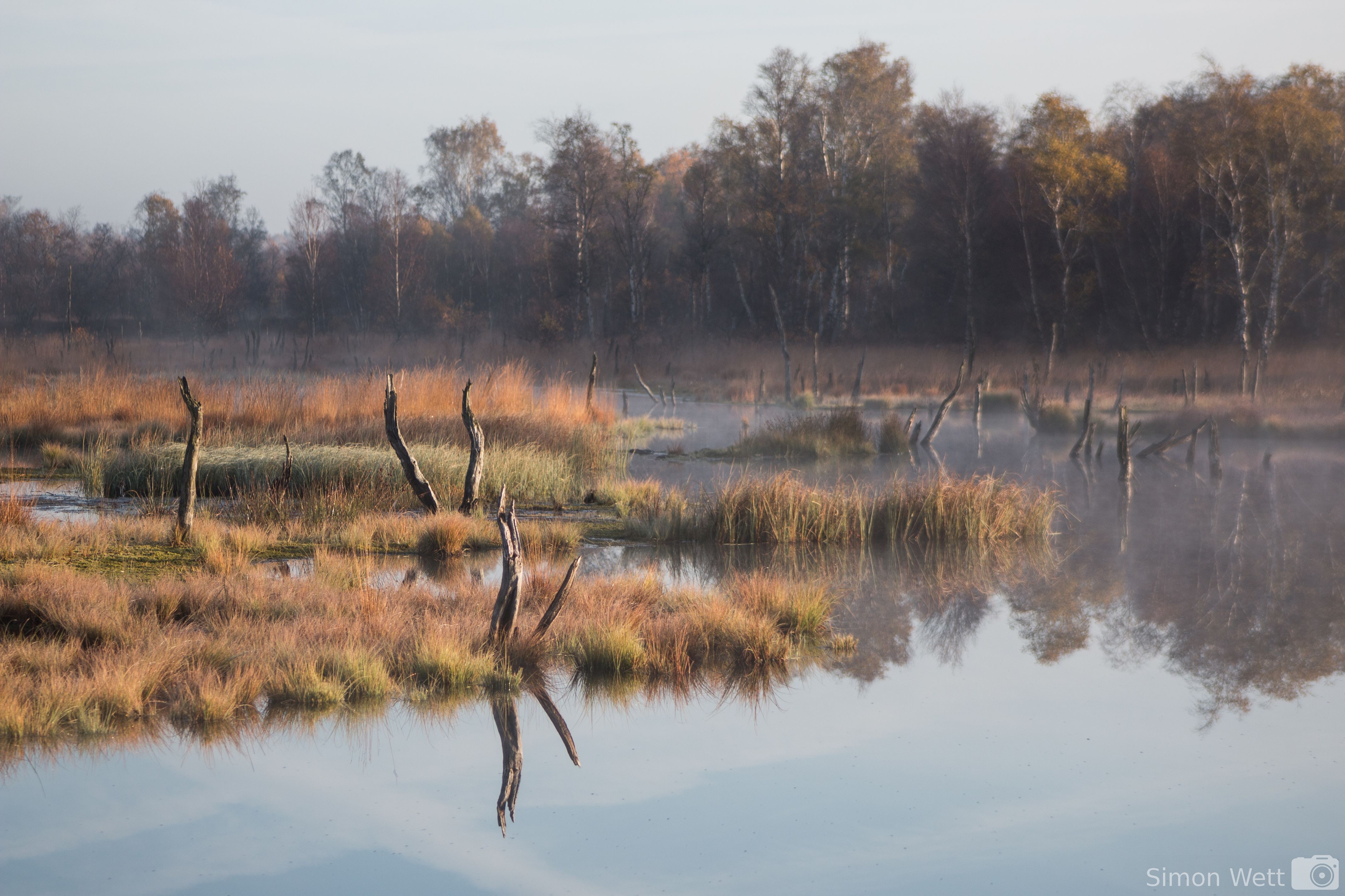 Der Herbst ist eine wunderbare Jahreszeit, alles erscheint besonders in der flachen Morgensonne in bunten Farben. Wenn dann auch noch ein leichter Dunst über der Landschaft liegt, bekommt diese einen fast märchenhaften Anschein. Ich bin am Montagmorgen im Wittmoor im Norden Hamburgs gewesen und habe den Sonnenaufgang abgewartet. Dort gibt es eine Wasserfläche, aus der unzählige tote Baumstämme ragen, was besonders im leichten Morgennebel eine ganz eigene Atmosphäre erzeugt.
