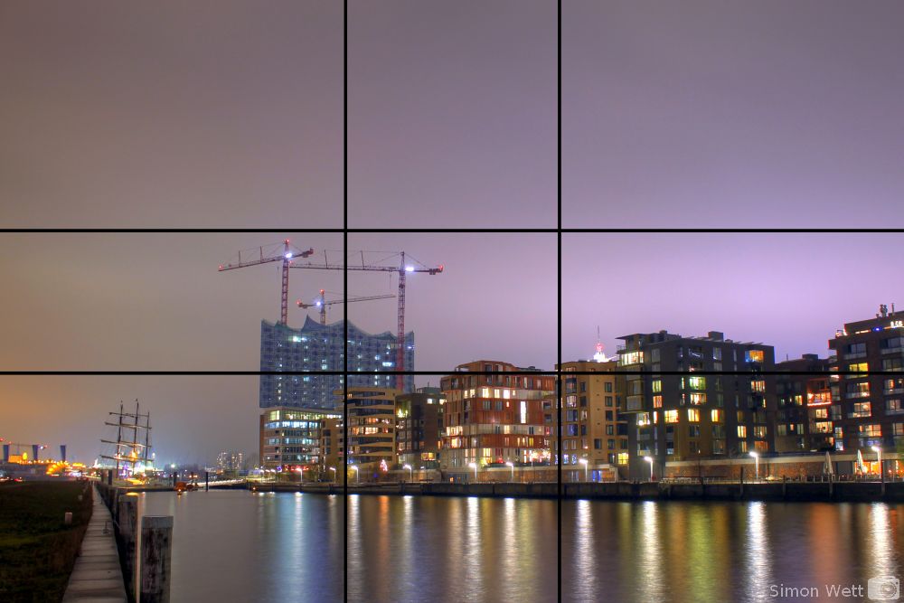 Es liegt also nahe den Goldenen Schnitt auch in der Fotographie anzuwenden und wenn ihr euch das obige Bild einmal genauer anschaut, werdet ihr feststellen, dass die Elbphilharmonie hier ziemlich genau in einem Schnittpunkt der Geraden liegt, die die Seiten des Bildes im Verhältnis des Goldenen Schnittes teilen.