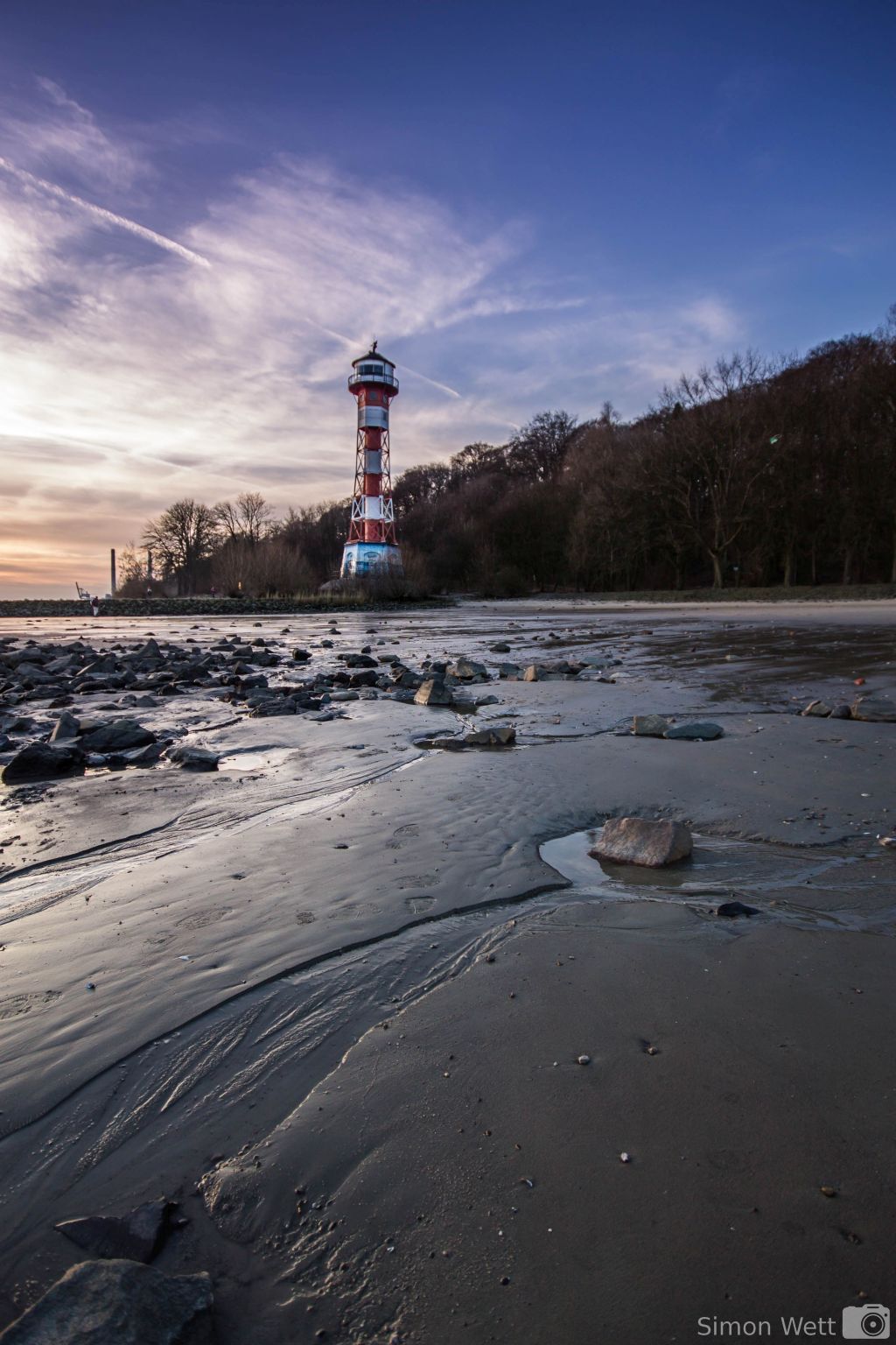 Dort bin ich ewig nicht gewesen und schon gar nicht zum Fotografieren. Dabei bieten der Leuchtturm und der Elbstrand wunderschöne Motive. Dazu kann man die Steine der Uferbefestigung und die, sich darum bildenden Pfützen sehr schön in den Vordergrund nehmen. Im Bild links kommt mir noch der Kondensstreifen am Himmel zupass, denn so bilden der kleine Priel und er zusammen zwei Linien, die das Auge in das Bild hineinführen, was allgemein als sehr harmonisch empfunden wird. Der Leuchtturm ist hier einfach noch zu weit entfernt um das Bild alleine zu dominieren und so hilft ihm ein ansprechender Vordergrund richtig zur Geltung zu kommen.