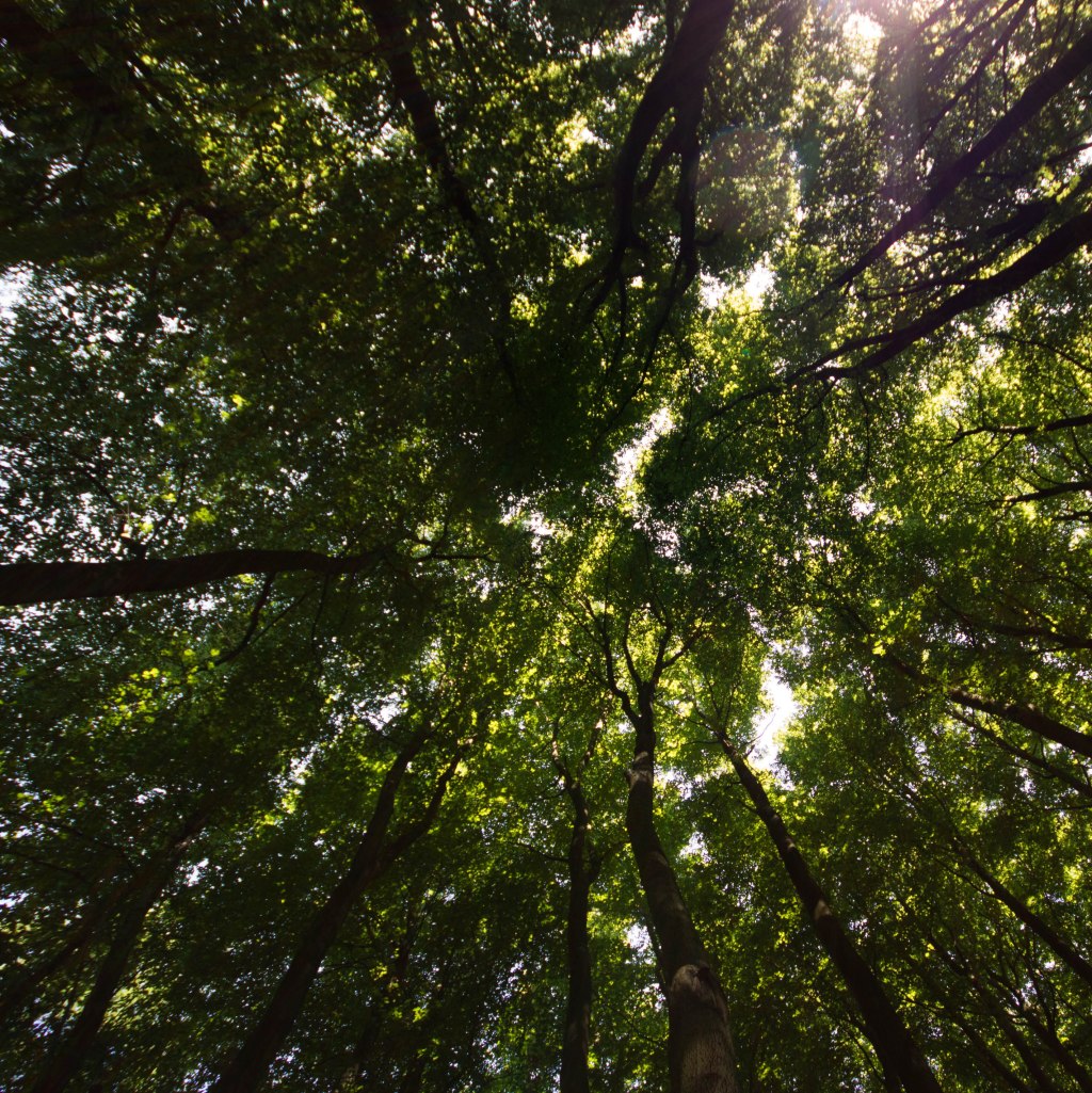 Das Licht, das durch die Blätter auf den Boden fällt ist wunderschön, speziell im Hochsommer (das Bild stammt aus dem Juli 2014). Ganz besonders beim Blick nach oben zeigt sich das satte Grün der Blätter. Da bietet sich ein Foto, senkrecht nach oben geschossen, an. Bei einem Weitwinkelobjektiv (10 mm) ensteht dabei noch der schöne Effekt, dass die Baumstämme alle auf die Mitte des Bildes zuzustreben scheinen.