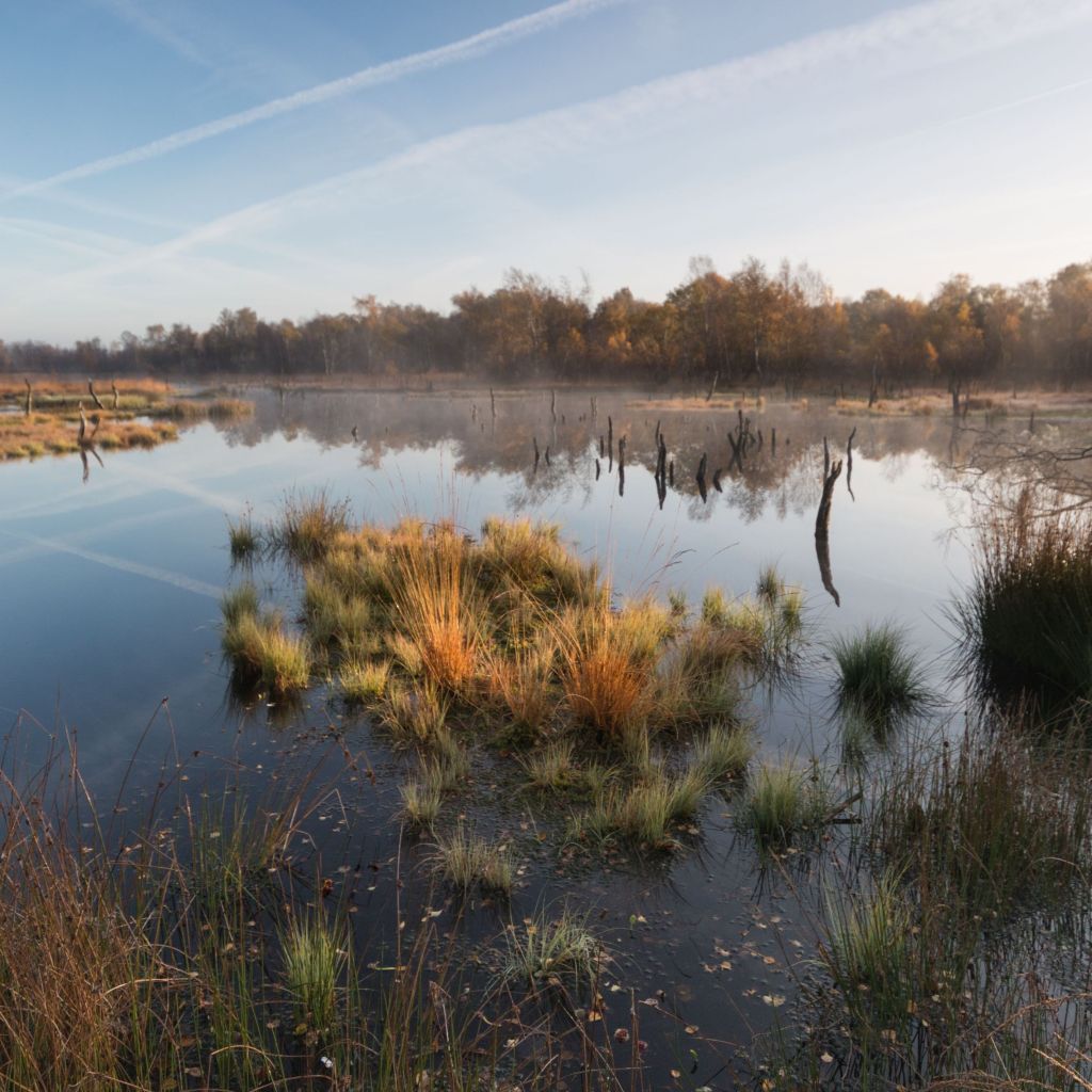 Der Herbst ist eine wunderbare Jahreszeit, alles erscheint besonders in der flachen Morgensonne in bunten Farben. Wenn dann auch noch ein leichter Dunst über der Landschaft liegt, bekommt diese einen fast märchenhaften Anschein. Ich bin am Montagmorgen im Wittmoor im Norden Hamburgs gewesen und habe den Sonnenaufgang abgewartet. Dort gibt es eine Wasserfläche, aus der unzählige tote Baumstämme ragen, was besonders im leichten Morgennebel eine ganz eigene Atmosphäre erzeugt.